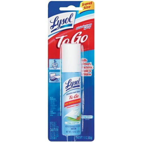 Lysol Spray to Go contains hospital-grade tuberculocidal, virucidal, fungicidal and bactericidal disinfectant and deodorant spray. Spray kills 99.9 percent of germs within 30 seconds. Highly effective against TB, MRSA, poliovirus Type 1, hepatitis A, pseudomonas, HIV-1 (AIDS Virus) and influenza A (H1N1 Virus). Original scent spray prevents odors and growth of damaging mold and mildew and does not contain chlorofluorocarbons (CFCs). Compact size travels well.